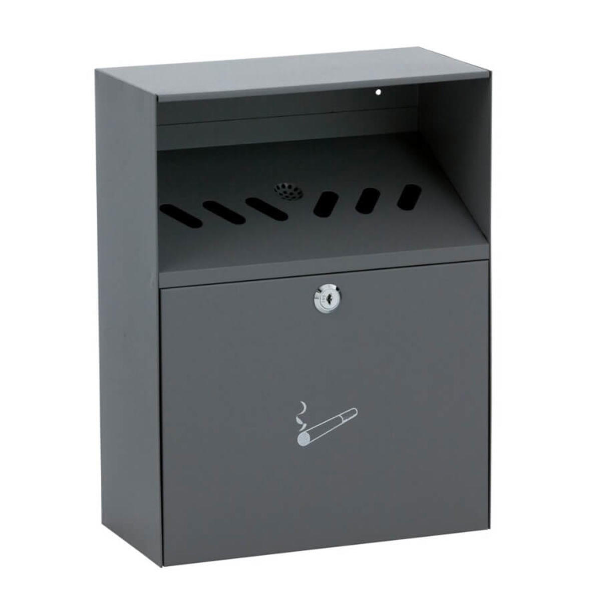 Praktisk askebæger til vægophæng med bredt indkast. Lavet i galvaniseret stål og rustfrit stål. Inderspanden er i galvaniseret stål. Nem at tømme ved at åbne frontpanellet med tilhørende nøgle.
