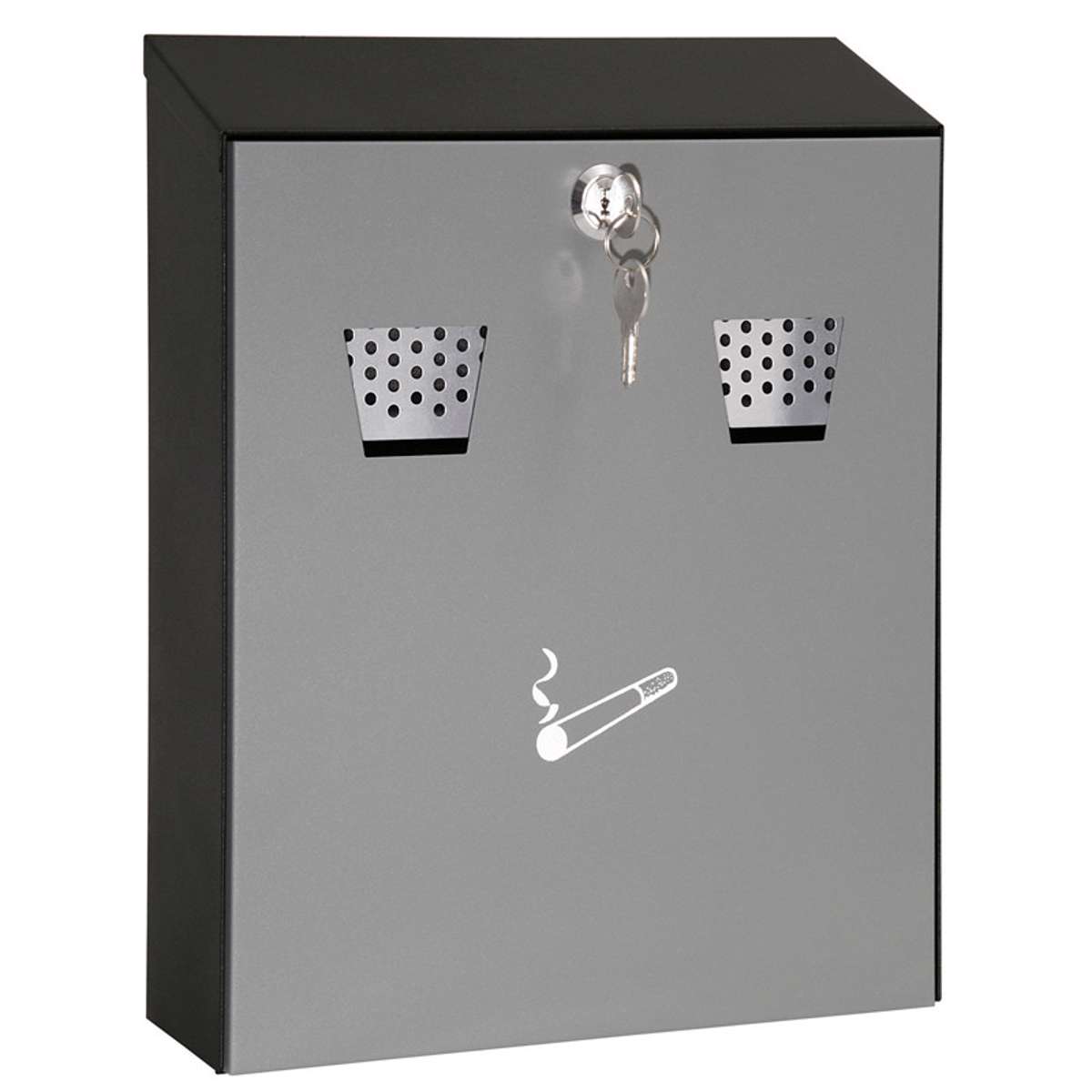 Væg-askebæger til udendørs brug i sort/grå og lakeret stål.