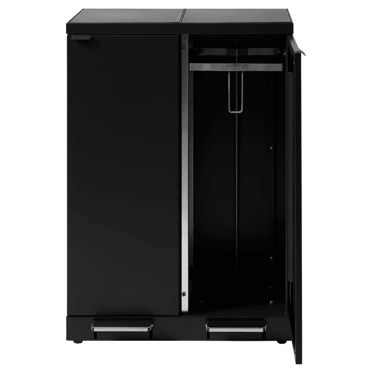 Systemet inkluderer frontdøre med soft close-funktion, der muliggør ergonomisk korrekt tømning uden tunge løft. Det har også indbyggede, robuste poseholdere, der sikrer posernes plads. Lågets gasdæmper sikrer en lydløs lukning og skjuler samtidig poserne for at opretholde et stilfuldt design. Justerbare fødder, skjult bag soklen, tilpasser sig lethed.
