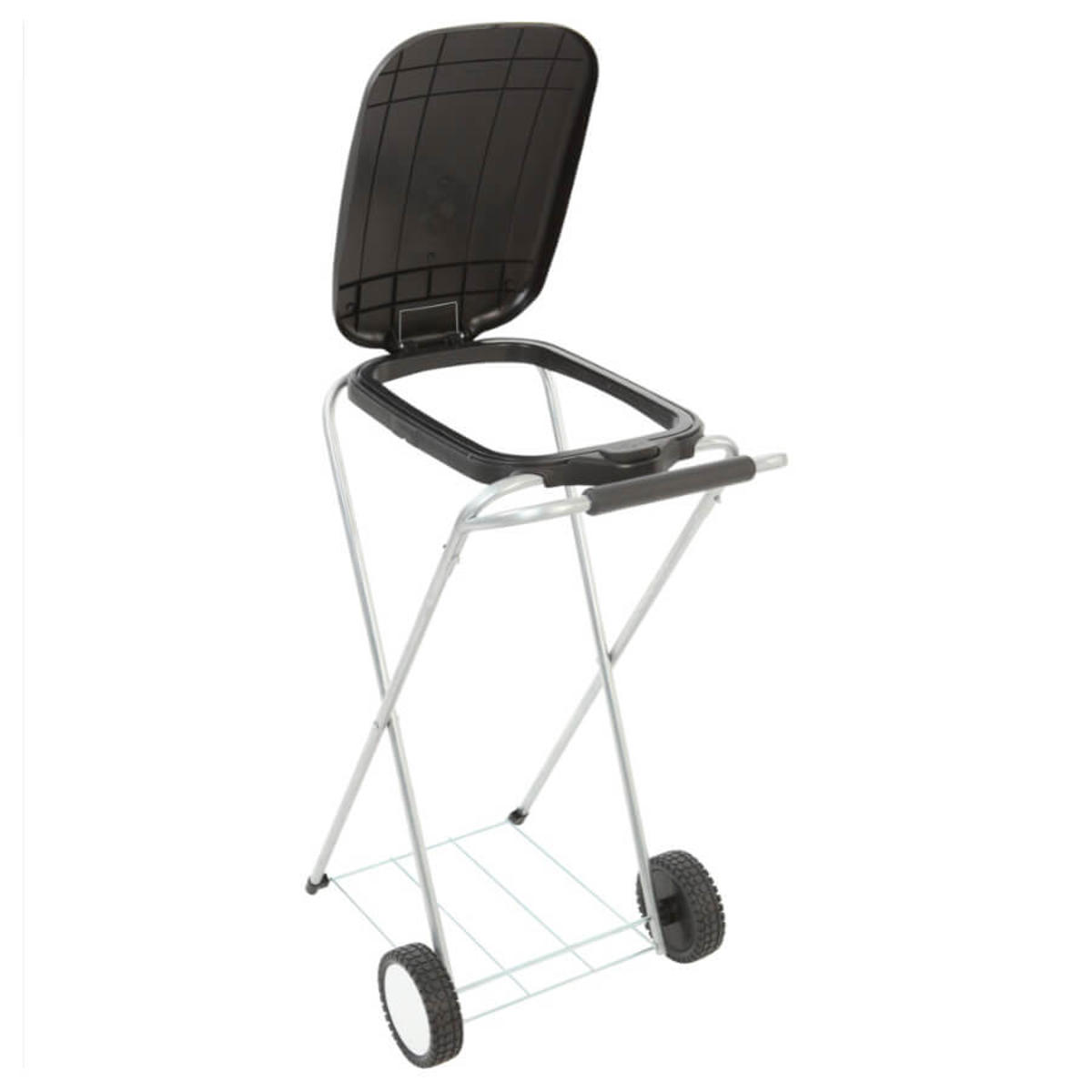 Praktisk, mobilt og stabilt affaldsstativ designet i galvaniseret metal, med et farvet låg udformet i plast. Låget åbnes let ved at klikke på knappen "Push". Udstyret med to polypropylenhjul, som gør den let at flytte. Affaldsstativet er udover sin holde-ring til posen, udstyret med en metal ramme i bunden, der sikrer, at affaldsposen pænt holder sig på plads, når stativet flyttes.