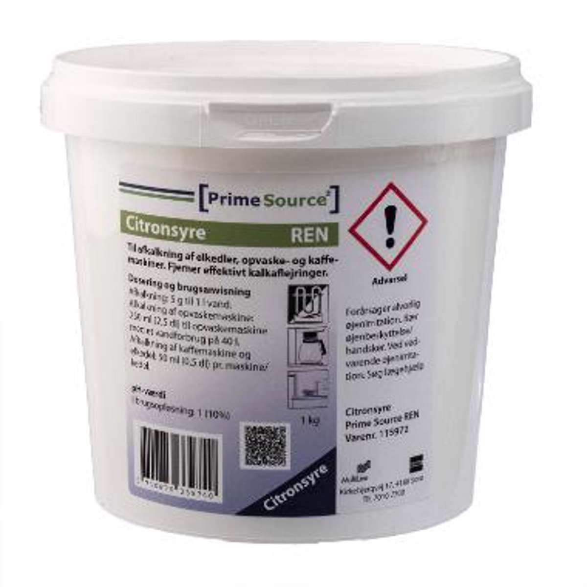 Prime Source Ren citronsyre kan benyttes til afkalkning af elkedler, opvaske- og kaffemaskiner o.a. Prime Source citronsyre er et hvidt pulver med neutral duft.