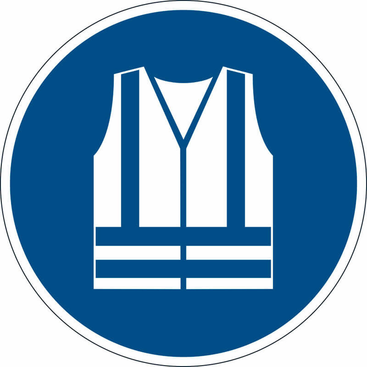 Registreret gulv sikkerhedsafmærkning til identifikation af farlige områder, opbevaringsrum, gangbroer m.m.. Registreret permanent påbudsskilt "Anvend sikkerhedsvest" M015 i henhold til ISO 7010. Selvklæbende til påsætning på indendørs gulve i lagerhaller, distributionscentre, produktionshaller m.m.. Slidstærk og hårdfør. Kompatibel med ISO 7010. Skridsikring R9 i henhold til DIN 51130. Mål: Ø 430 mm, tykkelse 0,4 mm
