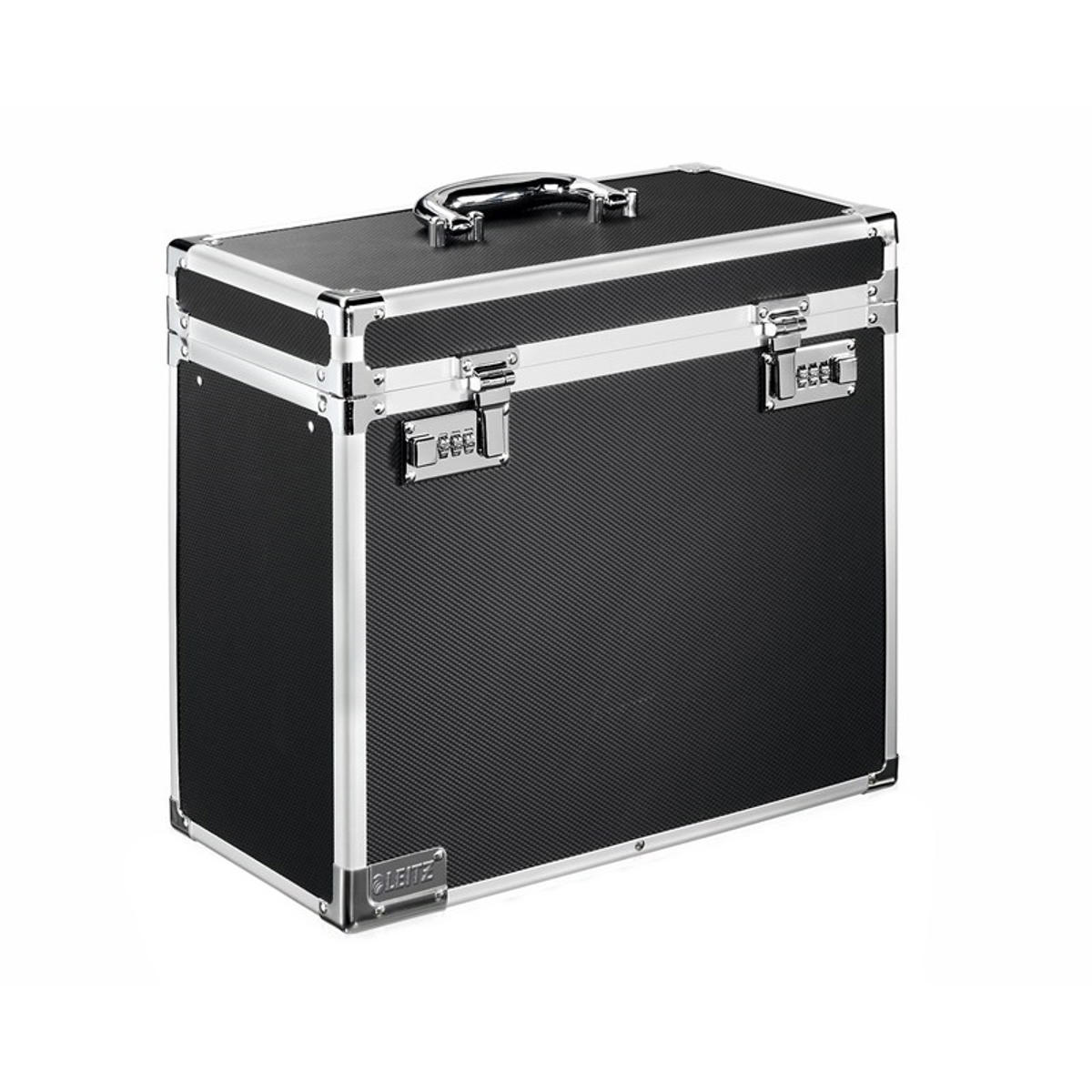 Bærbar arkivkuffert i eksklusivt look i sort/krom. Stærkt design med alu-kanter og forstærkede stålhjørner. Den indbyggede skinne har plads til ca. 15 fyldte hængemapper. Praktisk metalhåndtag på låget gør kufferten nem at transportere, og den dobbelte kombinationslås yder optimal sikkerhed. Med kortholder til navnekort.