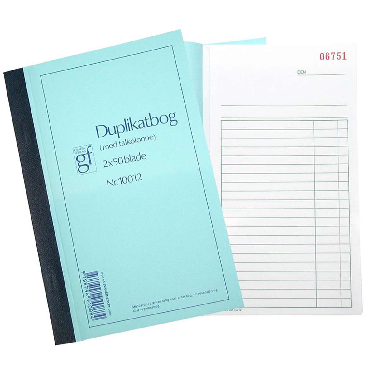 Praktisk duplikatbog med talkolonne og 2 x 50 blade. Standardbog til bogholderiet i din virksomhed. Anvendelig som ordrebog, følgeseddelbog eller regningsbog. Nummereret fra 1-25000 og nem at bruge. Fra Grafisk forlag.
