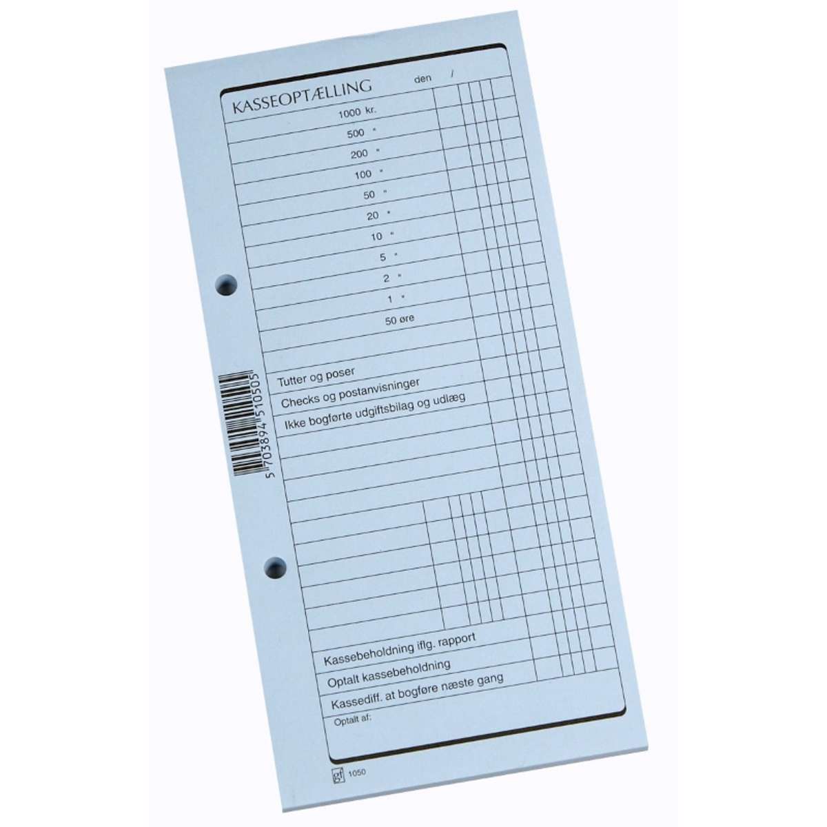 Toplimet kasseoptællingsblok med fortrykte felter til bl.a. dato, værdi, kassedifference mm. 100 blade med 2 huller til afrivning. Fra Grafisk forlag.