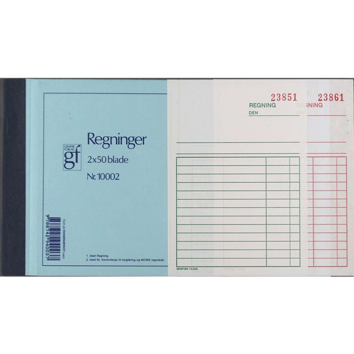 Regningsbog med kopi og 2 x 50 blade. Nummereret fra 1-25000. Fra Grafisk forlag.