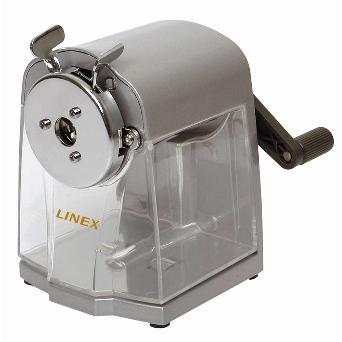 Sølvgrå bordmodel i retro design. Af metal med beslag. Til spidsning af alm. blyanter og farveblyanter fra 7,8 mm til 11,5 mm Ø.