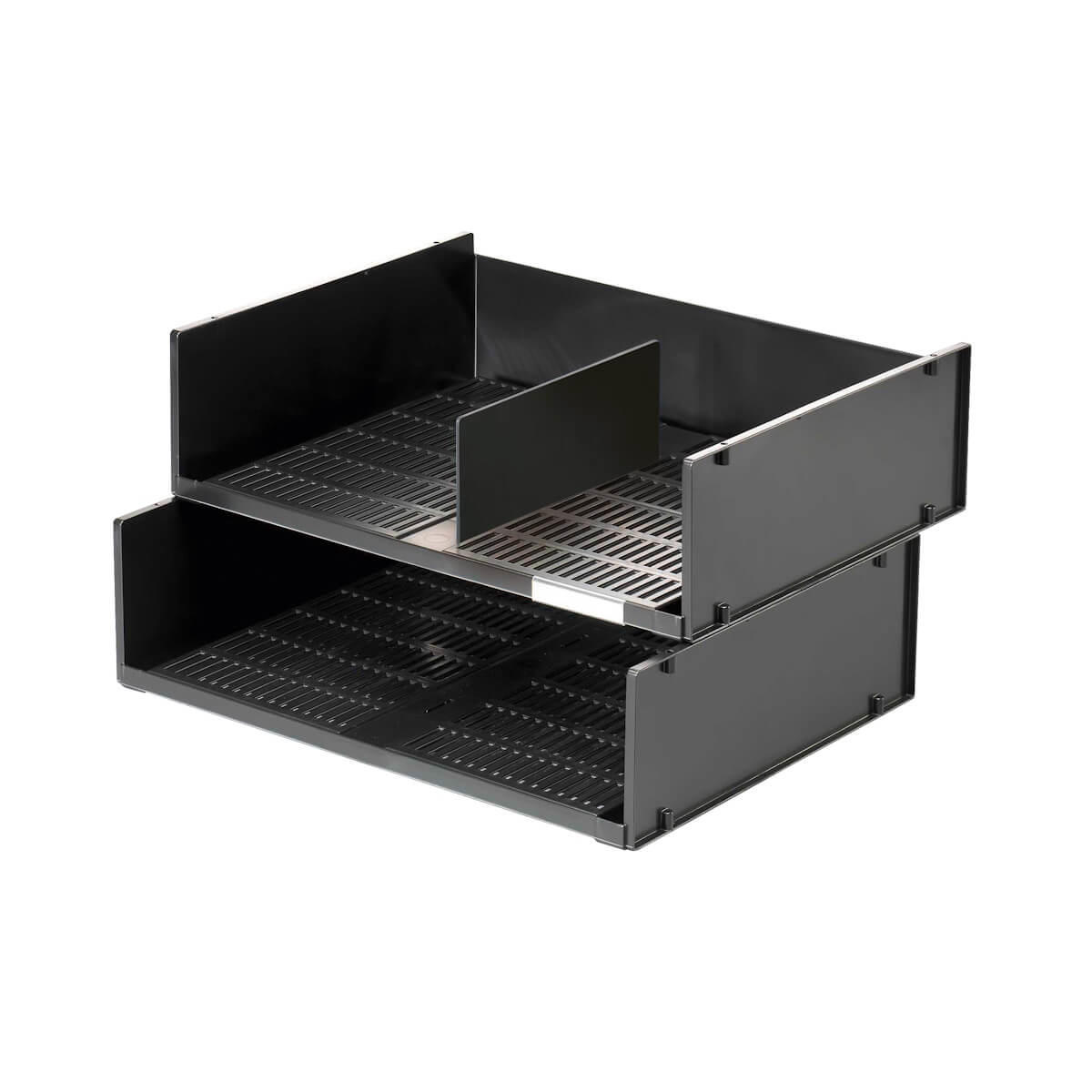 Stabelbar tværvendt brevbakke i A3 format. Åben på den lange side. Kan bruges med afstandsstykker (varenr. 1700132001). Af polystyren plast (min. 80% genbrugsmateriale). Produktet er miljøcertificeret af miljømærket Blue Angel.
