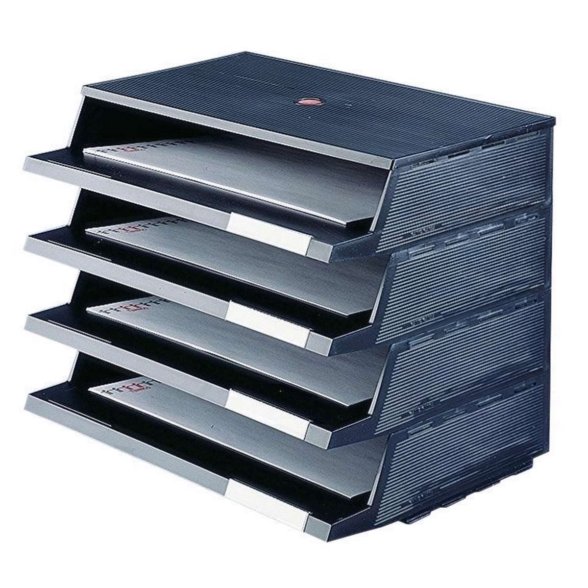 Enkelt og flot brevbakkesæt med 4 faste bakker og topplade i slagfast polystyren til at klipse sammen og stable eller hænge op på væggen. Med tværvendt A4 format og uden forkant eller udtræk er det super nemt at komme til dokumenterne, og få orden i papirerne. 4 lommer til forkant samt tekstindstik medfølger.