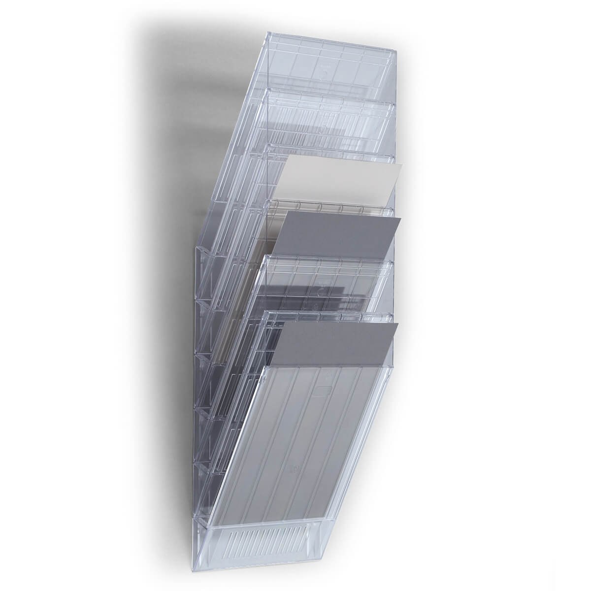 Brochurestativet er en del af den populære Flexiboxx-serie og er ideelt til at præsentere brochurer, kataloger eller blanketter i A4-format. Med seks rummelige bakker og en frontplade får du en enkel og effektiv løsning til organisering af dine tryksager – perfekt til vægmontering eller som fritstående på bordet.