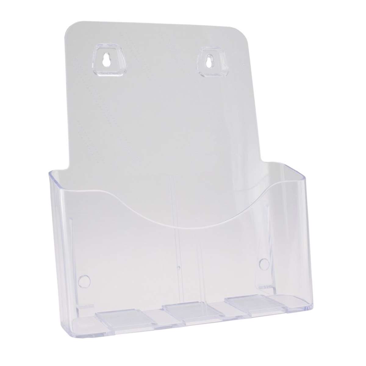 Brochureholder til A4 stående format med 1 rum. Holderen er fremstillet i plexiglas beregnet til dagligt brug. Få dit budskab / tilbud frem på en præsentabel måde gennem det flotte og enkle design. Brochureholderen egner sig lige fint til butikker, kontorer og i receptioner. Særdeles velegnet til at have med på messer, da det er let at medbringe i bagagen. Med hul til montering på væg.