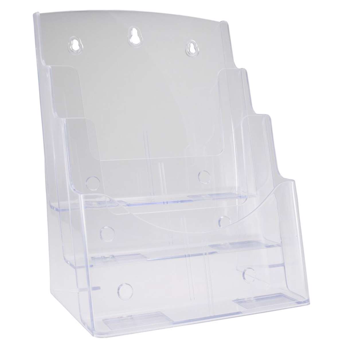 Brochureholder til A4 stående format med 3 rum. Holderen er fremstillet i plexiglas beregnet til dagligt brug. Få dit budskab / tilbud frem på en præsentabel måde gennem det flotte og enkle design. Brochureholderen egner sig lige fint til butikker, kontorer og i receptioner. Særdeles velegnet til at have med på messer, da det er let at medbringe i bagagen. Med hul til montering på væg.