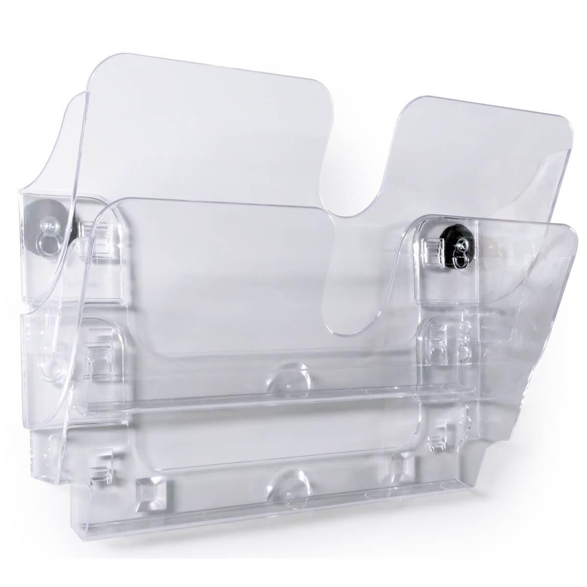De to separate bakker i liggende A4-format gør det nemt at opdele og fremvise forskellige materialer, fx brochurer, instruktioner eller interne opslag. Det kompakte design gør den særligt velegnet til steder, hvor pladsen er begrænset, men behovet for synlig information stadig er stort.