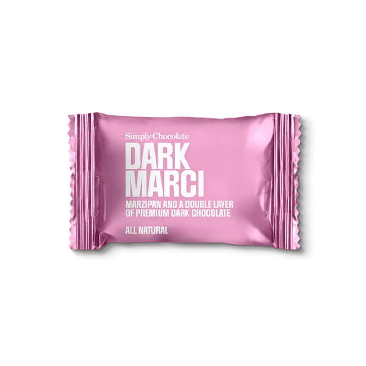 Simply Chocolate Bite Dark Marci Marcipan overtrukket med dobbelt lag mørk chokolade 10g i Display boks med 75 stk./pk.