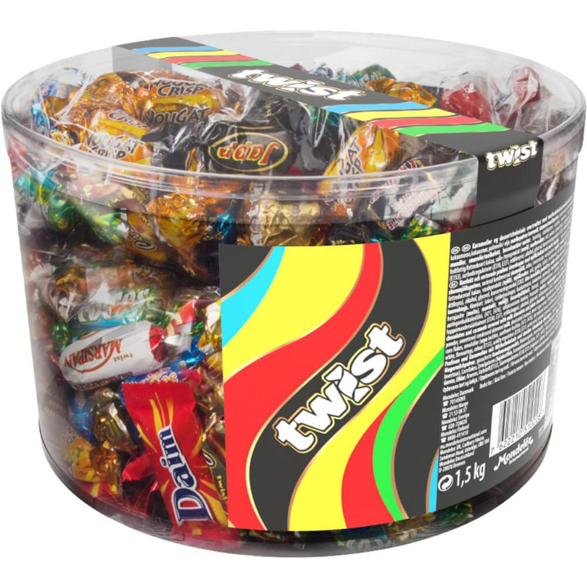 Er du på udgik efter kvalitets-chokoladebarer i miniatureudgaver, hvor alle kan finde mindst én de kan lide? Den eftertragtede Twist-pose blev lanceret i 60’erne, da alle twistede løs til Beatles. I dag er testen på et sandt venskab, om man kan dele en pose Twist uden at komme op at toppes om de samme stykker! I posen finder du 15 forskellige slags kvalitets- mini-chokolader fx Daim, Yapp, Coco og Toffee men også lakrids, caramel og nougatcrisp. Den blandede pose med individuelt pakkede chokolader er perfekte til mødelokalet med de vigtige kunder og til konferencen. Den er lige velegnet til at forkæle medarbejderne til jul eller til kaffen til sommerfesten. Den vil gøre gavekurven til jubilæet eller fødselsdagsbarnet festlig og vellykket. Indeholdende 1,5 kg i plastbøtte.