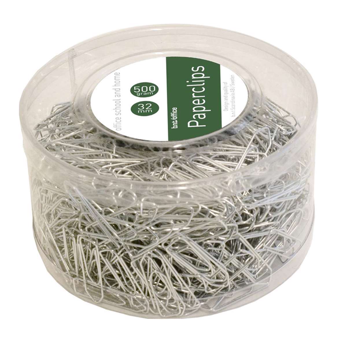 Store metal-papirclips med stærkt greb i plastikbøtte. Længde: 32 mm. En effektiv måde at samle løse dokumenter på og clipsene her holder dem godt på plads.