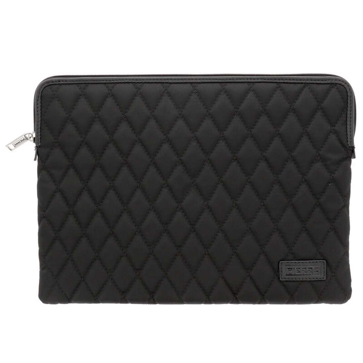 Smart computer etui i nylon med stikninger og læder detaljer.