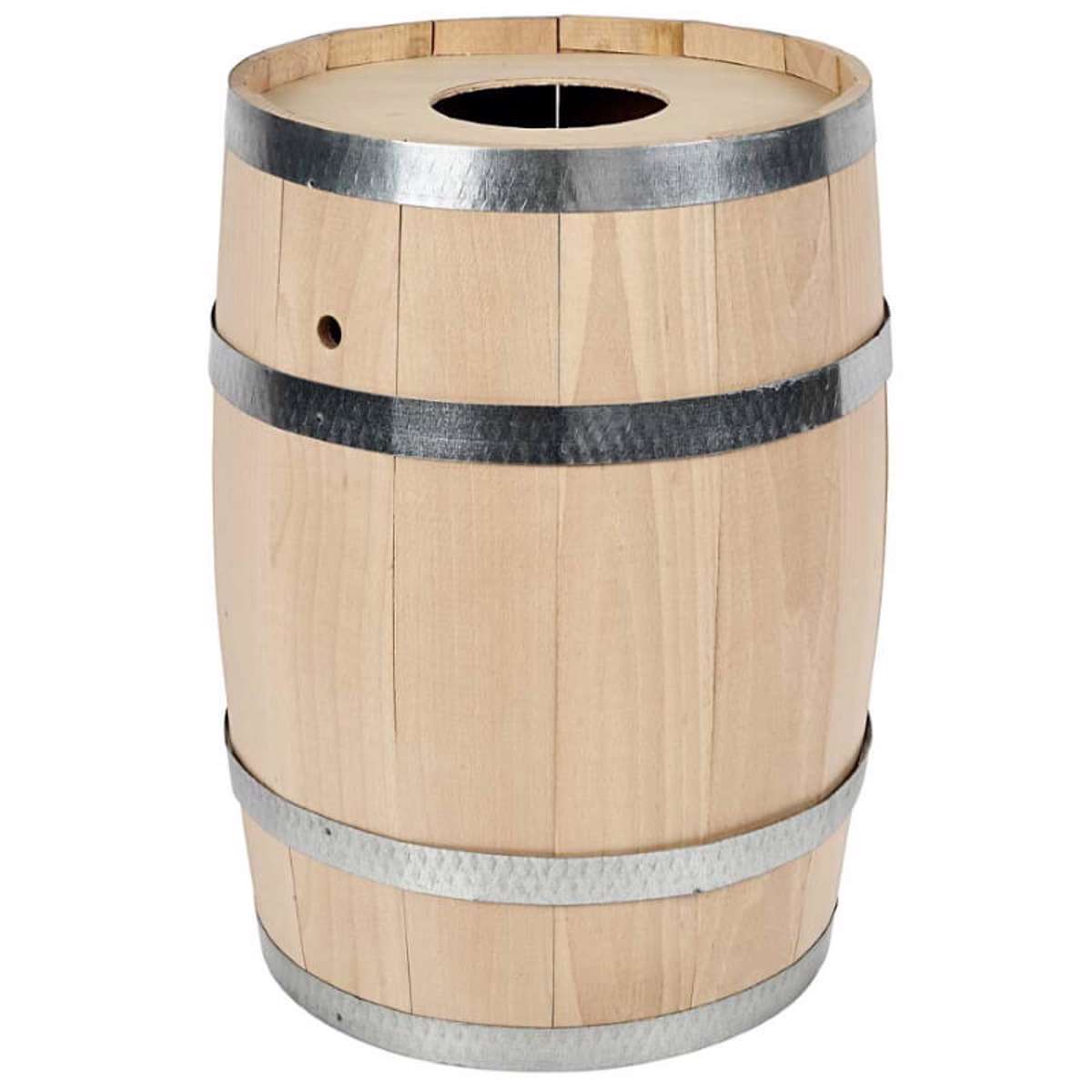 Tønde af buede stave i bøg holdt sammen af fire brede tøndebånd i metal. Øverst med rundt hul og i siderne huller til ophængning. Fremstillet i Danmark.