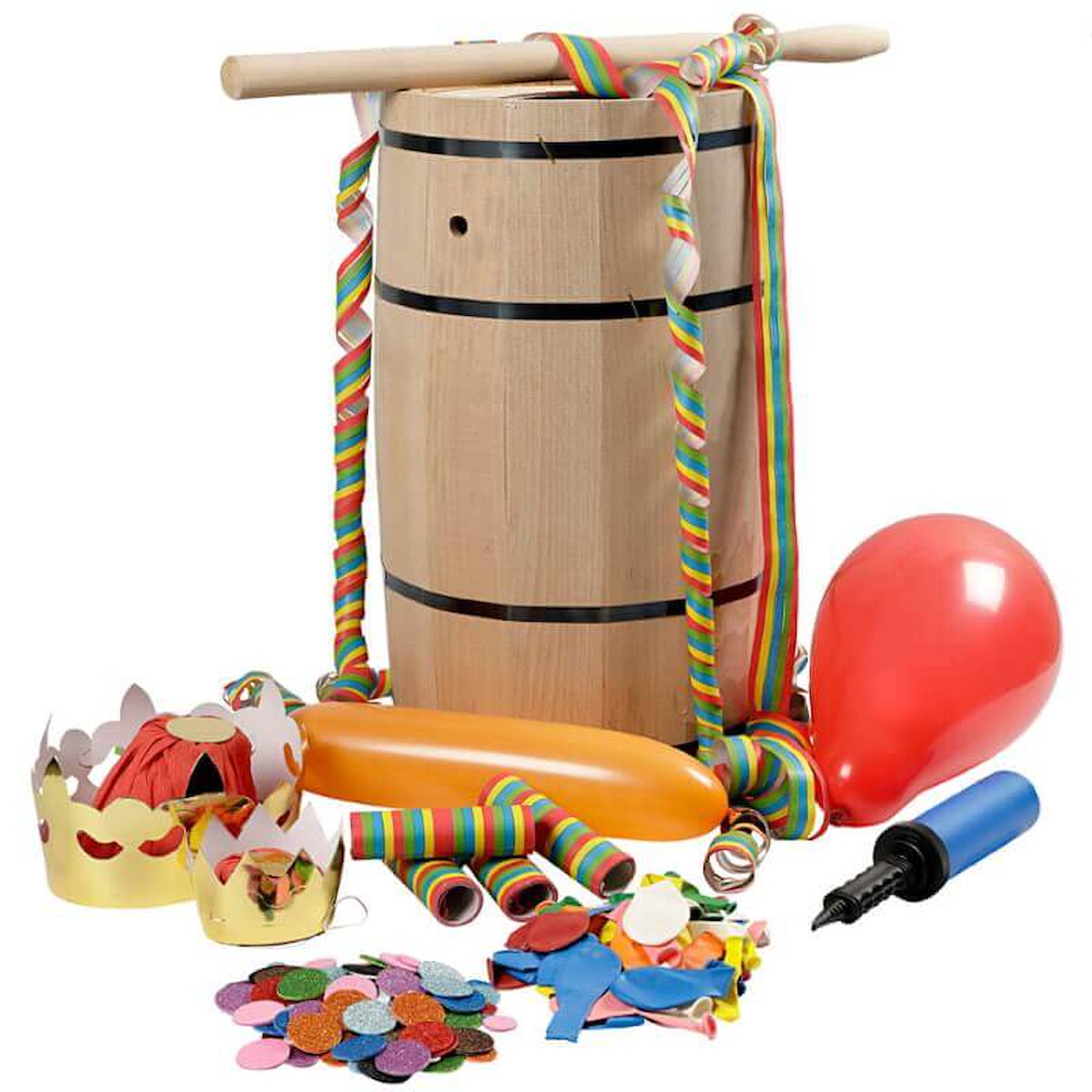 Sæt med fastelavnstønde, kølle, kroner og farverigt pynt til fastelavnsfesten. Tønden tåler ikke vand.