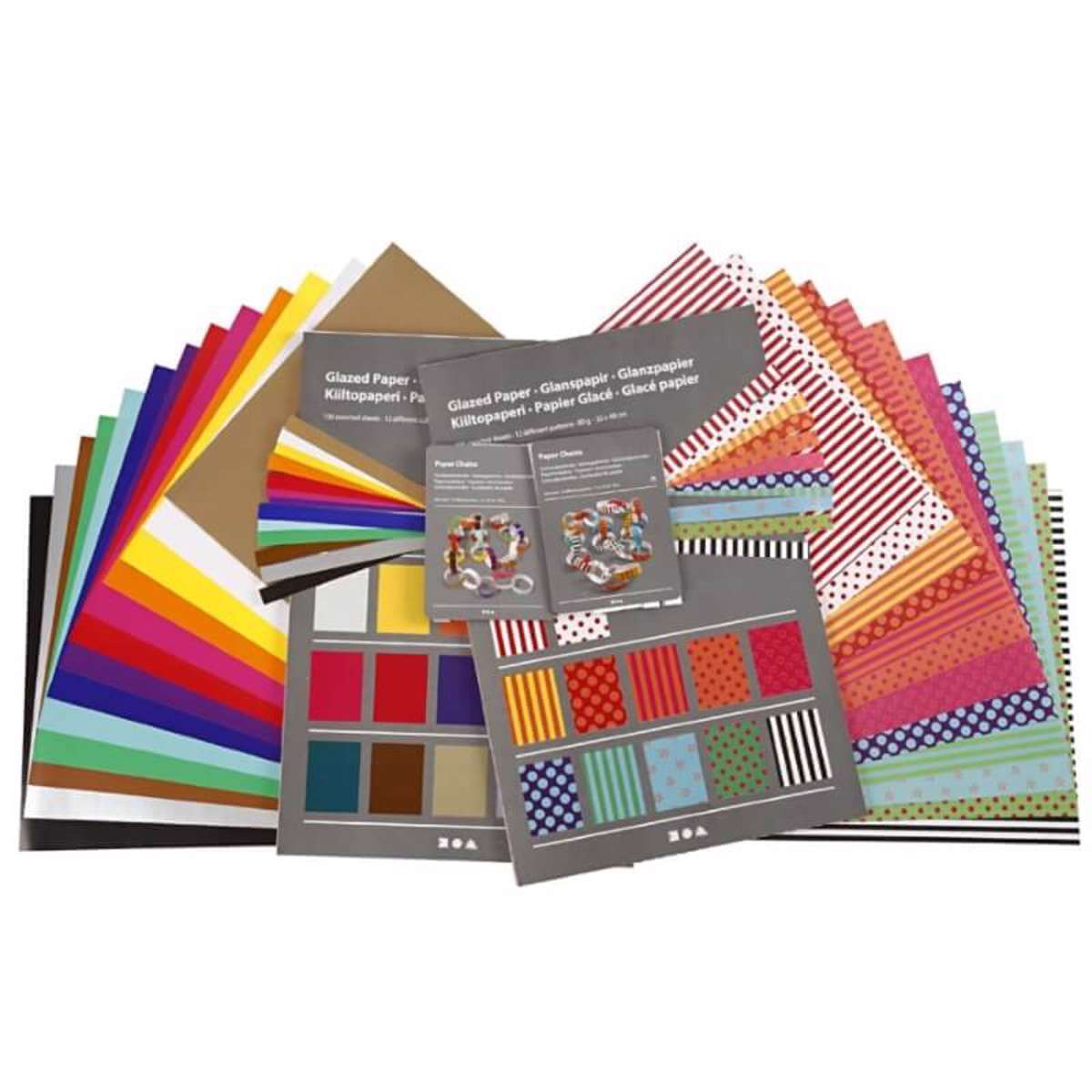 Indhold: 1600 ass. guirlandestrimler, 100 ass. mønstrede ark og 100 ass. ensfarvede ark.