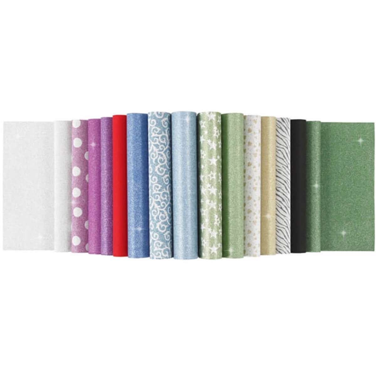Sortiment af mat papir trykt med glitterlak på den ene side af hvert ark. I alt 10 ensfarvede og 5 mønstrede ark a 2 stk.