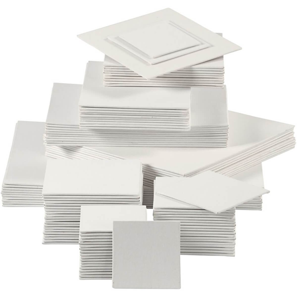 Sættet indeholder i alt 108 hvide malerplader fordelt på praktiske standardstørrelser, så du nemt kan vælge det format, der passer til dit motiv.