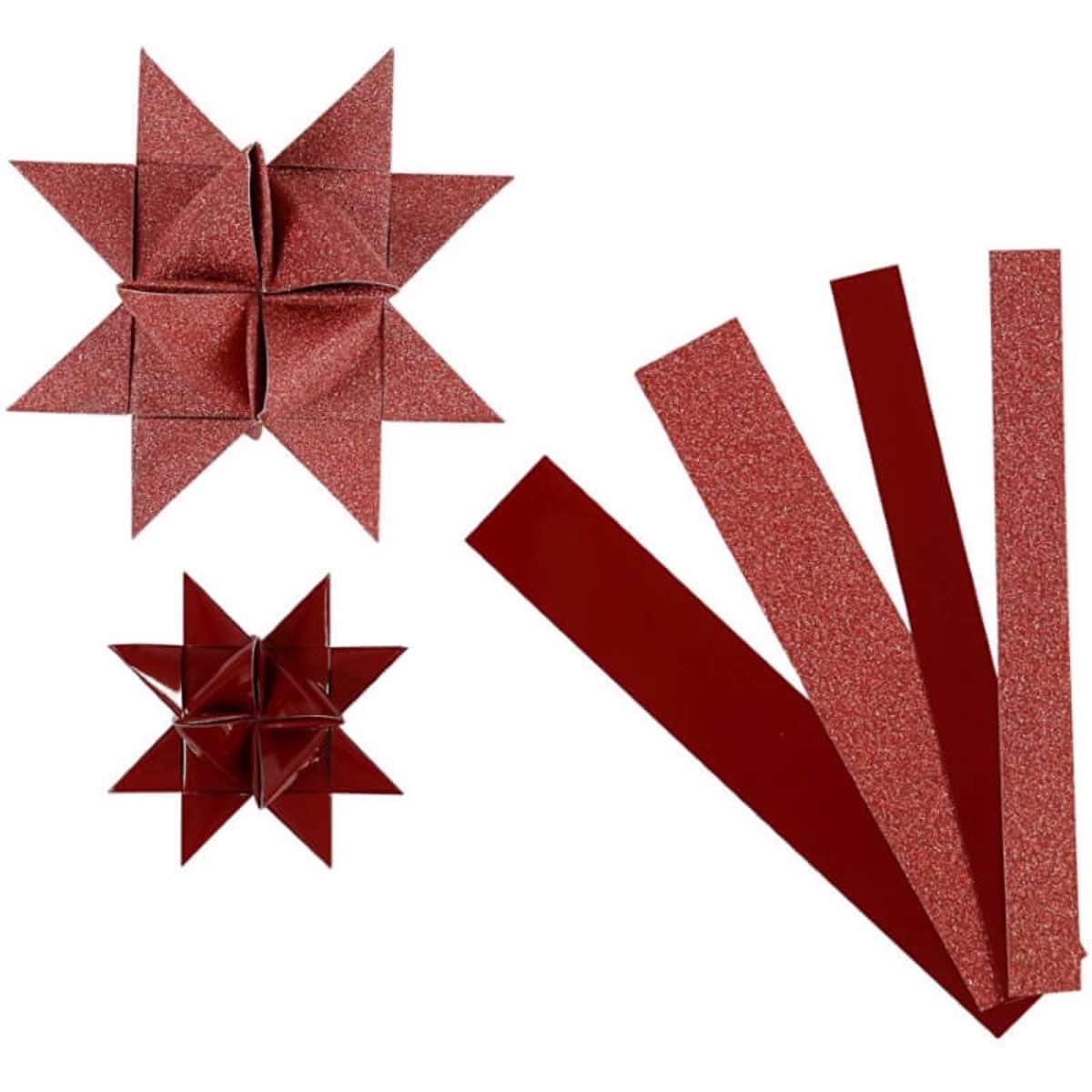 Stjernestrimler i rød glitter og lak - 1 Pk., 40 Strimler, L: 44+78 cm, Diam. 6,5+11,5 cm, B: 15+25 mm - Skab varm og festlig julepynt - DIY