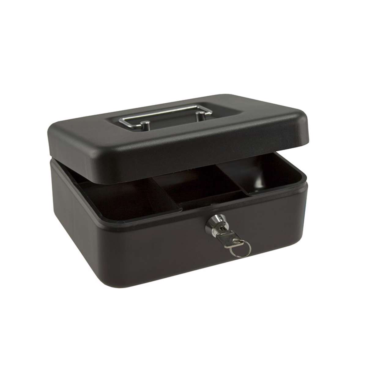• Pengekasse i formstøbt stål med 6 rums møntbakke i plastik. Der medfølger to nøgler til cylinderlåsen.