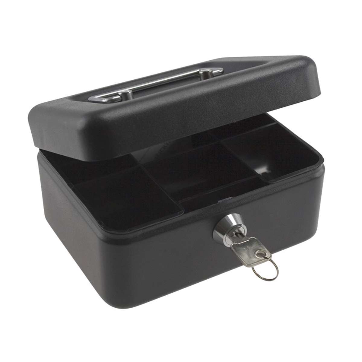 Pengekasse i formstøbt stål med 6 rums møntbakke i plastik. Der medfølger to nøgler til cylinderlåsen.