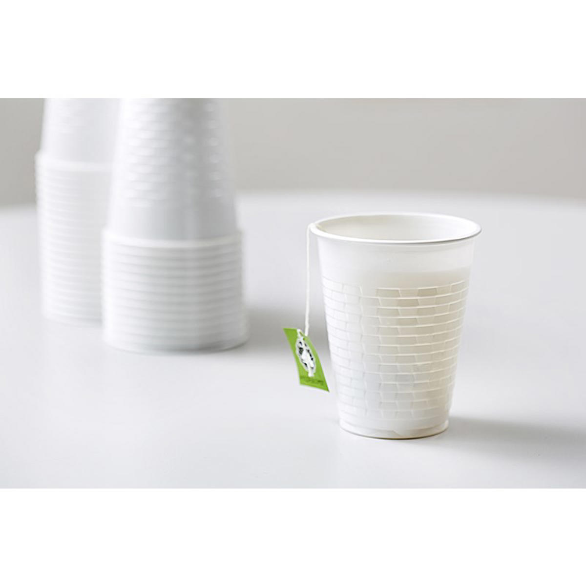 Hvidt plastikbæger med riller på midten. 21 cl. Også egnet til varme drikke. Højde 98 mm.