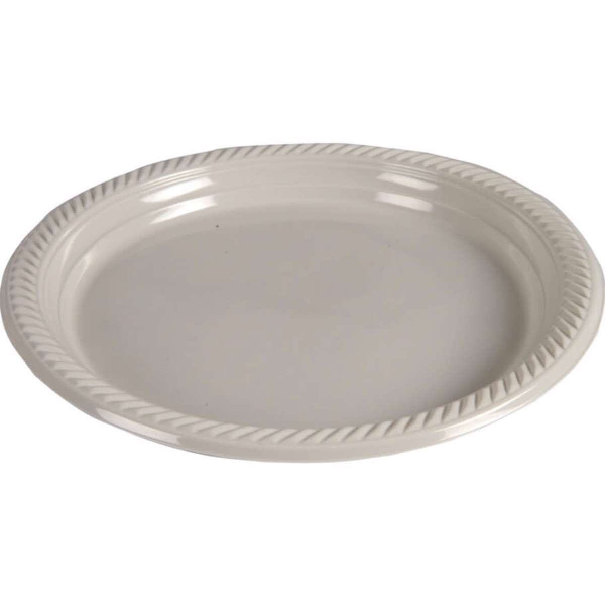 Lysegrå tallerken fremstillet i PP(Polypropylen plast), som egner sig til flergangsbrug og en tur i opvaskemaskinen og mikroovnen. Tallerkenen er fremstillet af 100 % genanvendelig PP ved korrekt sortering. Produktet er testet og har bestået 125 vaskecyklusser iht. EN 12875-1:2005, og er testet i både opvaskemaskine og industriopvaskemaskine, hvor slutskyllet havde en temperatur på 81°C. Måler 26 cm i diameter og indeholder 25 stk./pk.