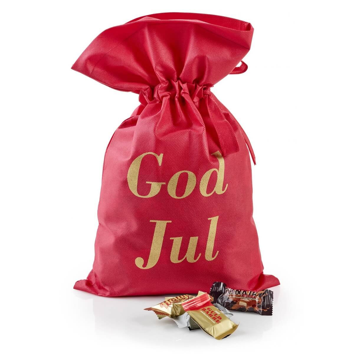 Julegave 2025 – Rød stofpose med “God Jul” med Toms Mini favoritter er en gave, der rammer plet, uanset om den gives til kunder, kollegaer eller familie.