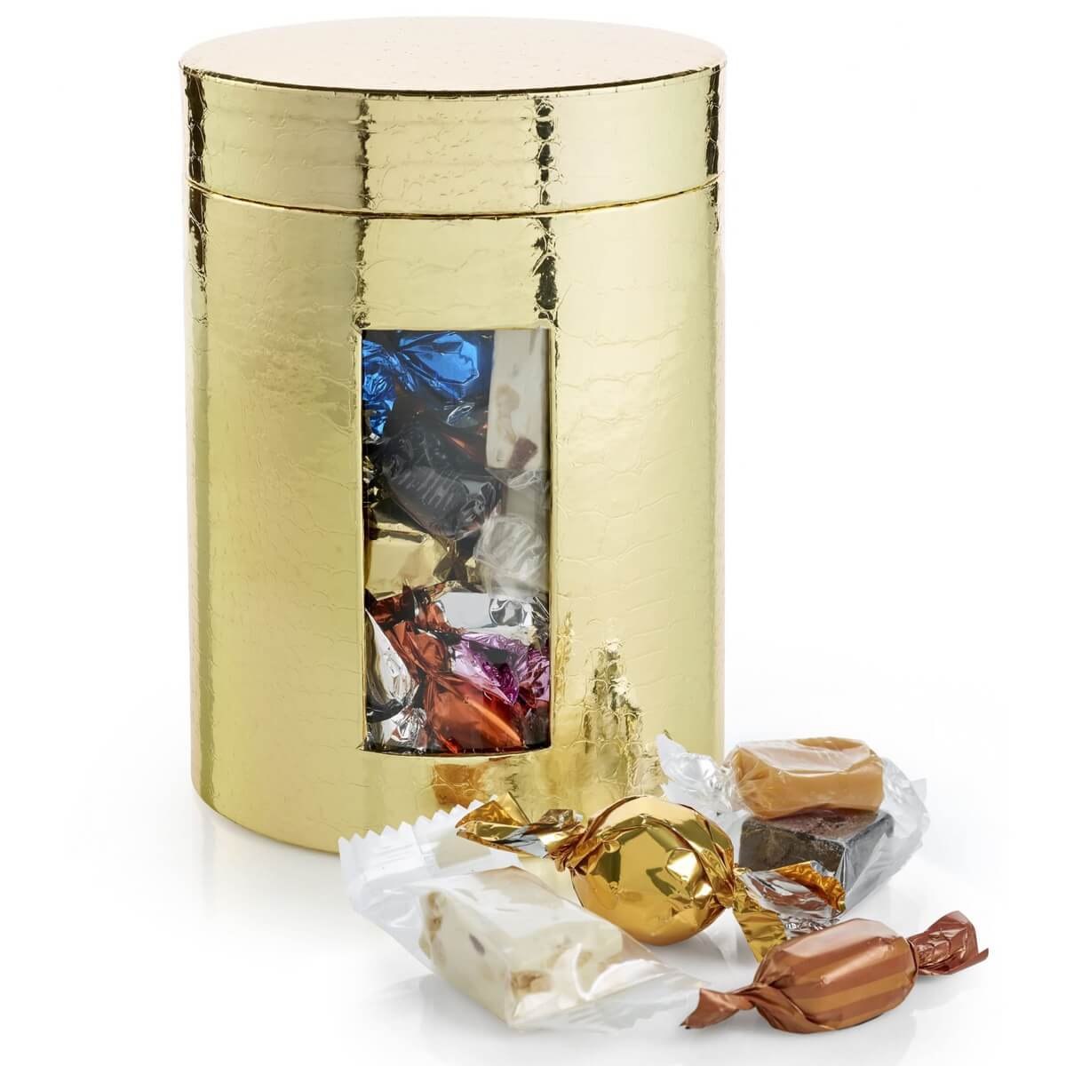 Som firmajulegave er den runde hatteæske et oplagt valg. Den gyldne æske udstråler eksklusivitet og viser omtanke, mens indholdet giver et bredt udvalg af både chokolade, karameller og meget mere, til de som elsker at afprøve forskellige smagsvarianter.