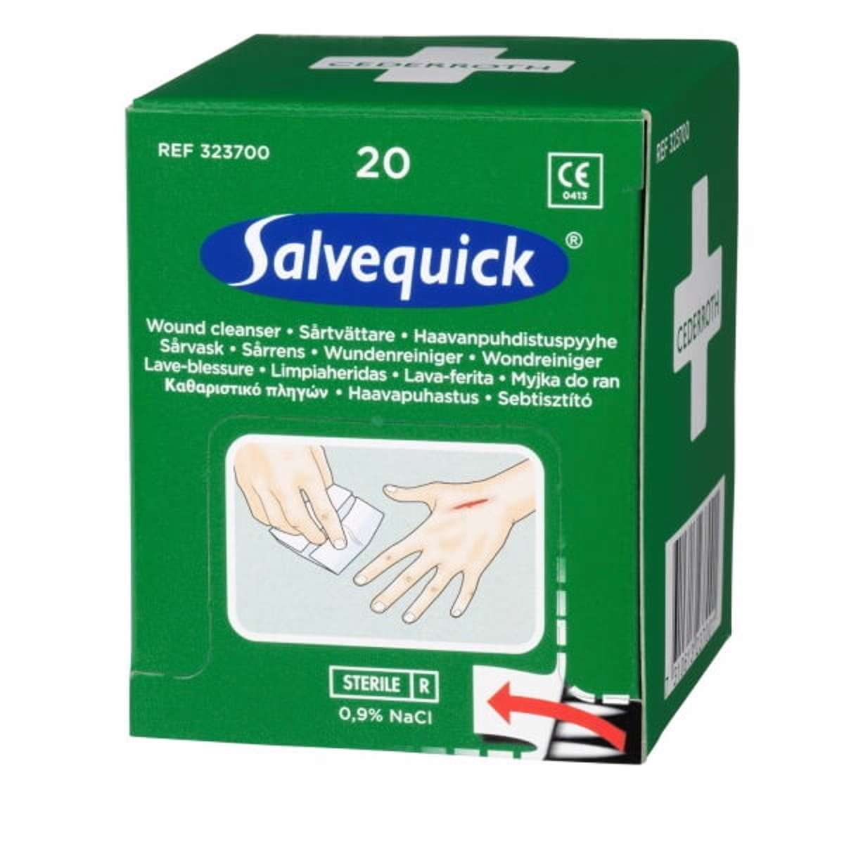 Salvequick Sårrens passer til Cederroth Førstehjælpsstation. Rengøringsvæsken består af steril fysiologisk saltvandsopløsning 0,9% NaCl. Servietterne er stykemballeret.