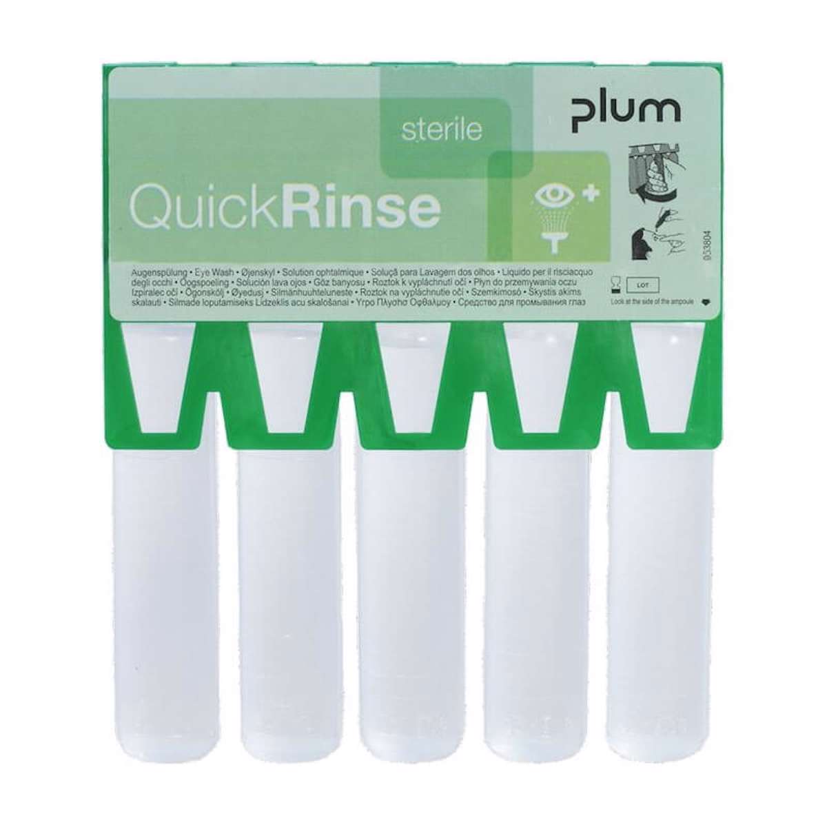Anvendes til skylning af øjne forurenet med fremmedlegemer (støv, snavs mm.) Ampuller med knækhals indeholder sterilt isotonisk natriumklorid. Passer til førstehjælpsstationerne fra Plum. Anvendes til øjenskyl, hvor der er kommet støv eller fremmedlegeme i øjet. Kan også anvendes til skyl af hud ved skader på huden, sårrens mv. Er kun til udvortes brug.