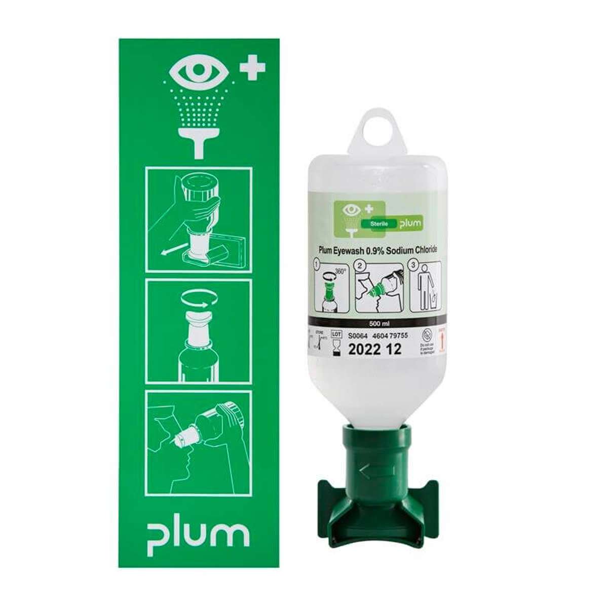 Vægstation med 1 x 500 ml Plum Øjenskyller og løst piktogram. Specielt velegnet til steder, hvor øjeblikkelig skylning er påkrævet, til mindre arbejdspladser - samt til mobile arbejdspladser.
