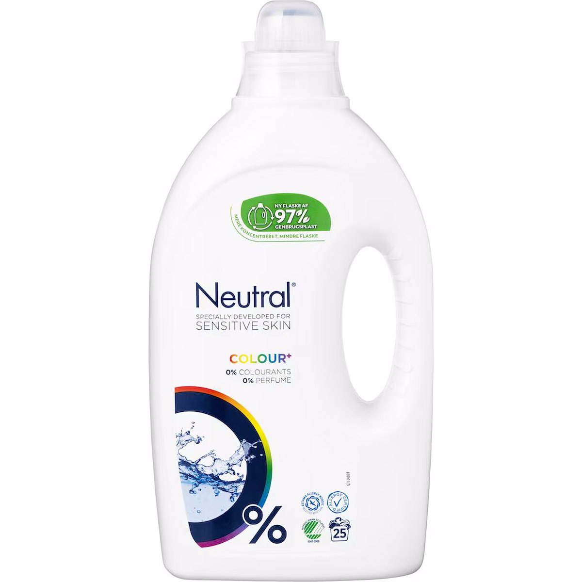 Neutral colour vaskemiddel er både dermatologisk testet og godkendt, svanemærket - samt deklareret i samarbejde med Astma-Allergi forbundet og indeholder ingen parfume eller farvestoffer, hvilket reducerer risikoen for allergi- og overfølsomhedaproblemer.