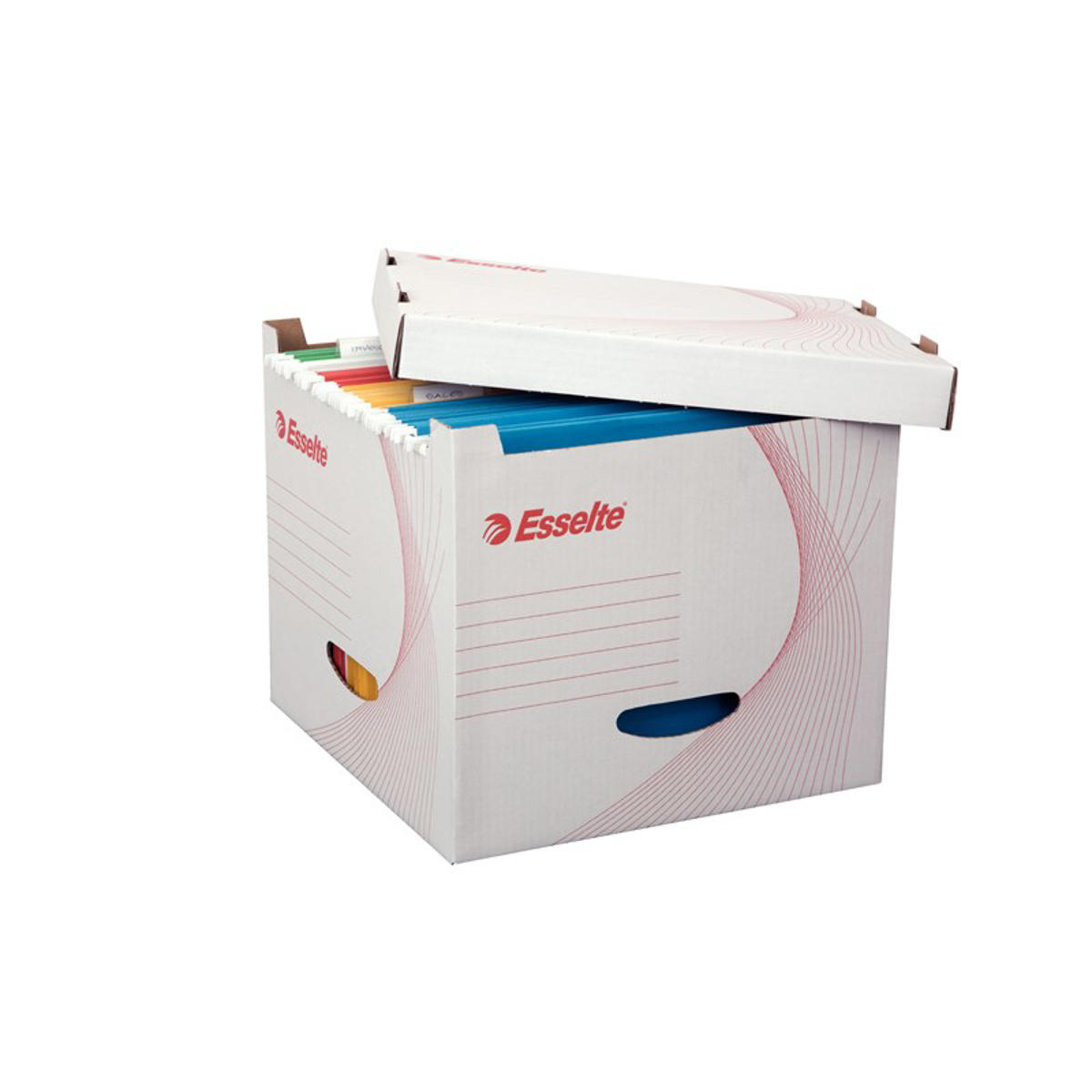Hængemappekasse fra Esselte til opbevaring af dokumenter i hængemapper. Kassen har forstærkede sider, hvilket stabiliserer kassens når den er fyldt og kan indeholde op til 20 fyldte hængemapper. Kassen er fremstillet af 100% recirkuleret bølgepap, og kommer i pakninger med 5 stk.