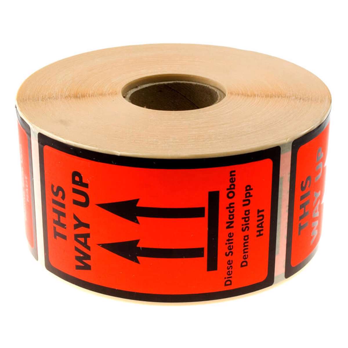 Fluorescerende selvklæbende etiket med sort print: This Way Up. Format 120x70 mm, 1000 etiketter per rulle.