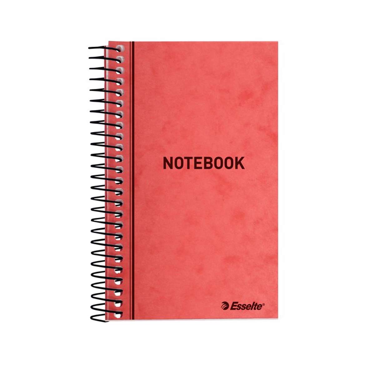 Spiralnotesblok med omslag i rød glanskarton og sort spiral i venstre side. Hvidt, glittet skrivepapir med 50 linjerede sider og 6 mm linjeafstand i gråt tryk. Notesblokken er Svanemærket.
