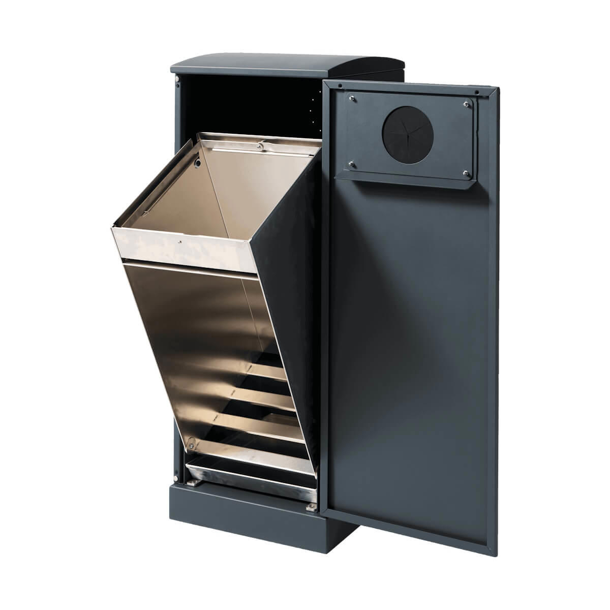 • Praktisk Design Med en højde på 110 cm og en bredde samt dybde på 42,5 cm, passer denne affaldscontainer let ind i kontormiljøer, kantiner og andre offentlige rum. Frontdøren gør det nemt at tømme beholderen, uden at skulle løfte tunge affaldsposer. Containerens kvadratiske design og rene linjer bidrager til et enkelt og stilfuldt udseende, mens de skjulte hængsler giver et strømlinet look.