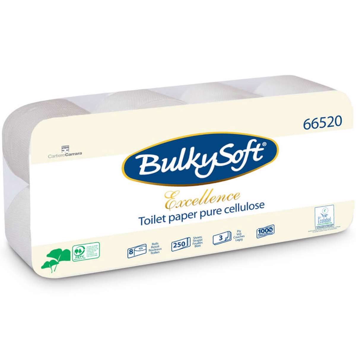Bulky Soft Excellence 3-lags hvidt toiletpapir superblødt og samtidig PEFC-certificeret og mærket med EU-Ecolabel ( EU-Blomsten )