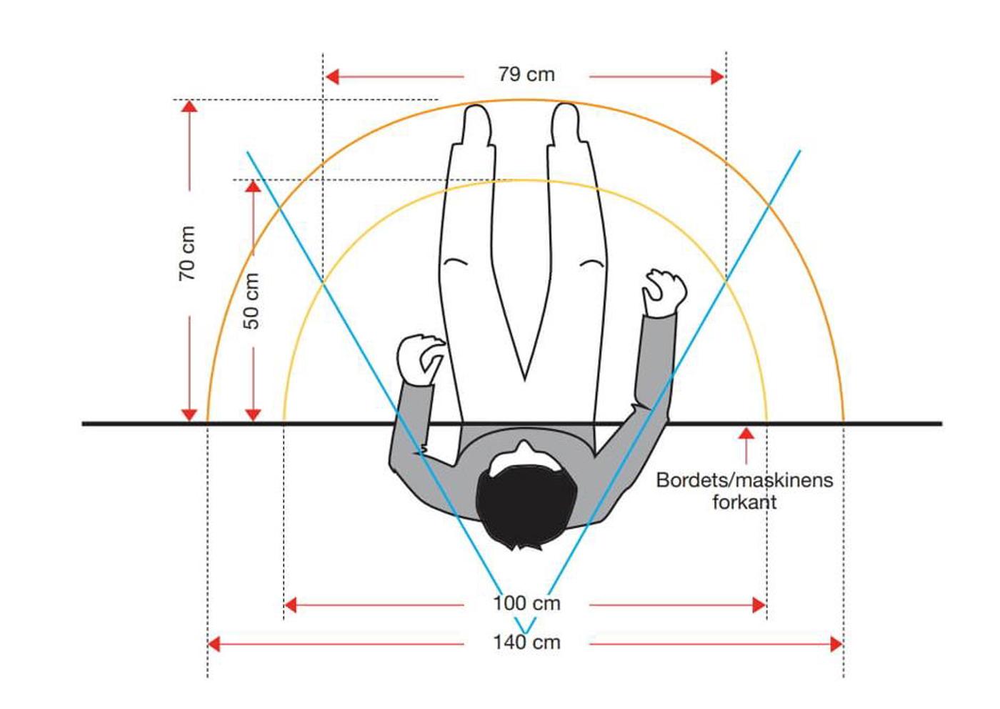 Arbejder medarbejderne kun i ét arbejdsområde, det vil sige inden for en 60 graders vinkel (se figur 1) er det mindste behov for benplads i bredden 79 cm (se figur 3). Hvis medarbejderne arbejder over en større del af bordfladen, stiger kravet til fri benplads. Behovet for fri benplads stiger til 100 cm i bredden i knæhøjde og 140 cm i bredden i fodhøjde, når medarbejderne arbejder over hele bordfladen med armene.