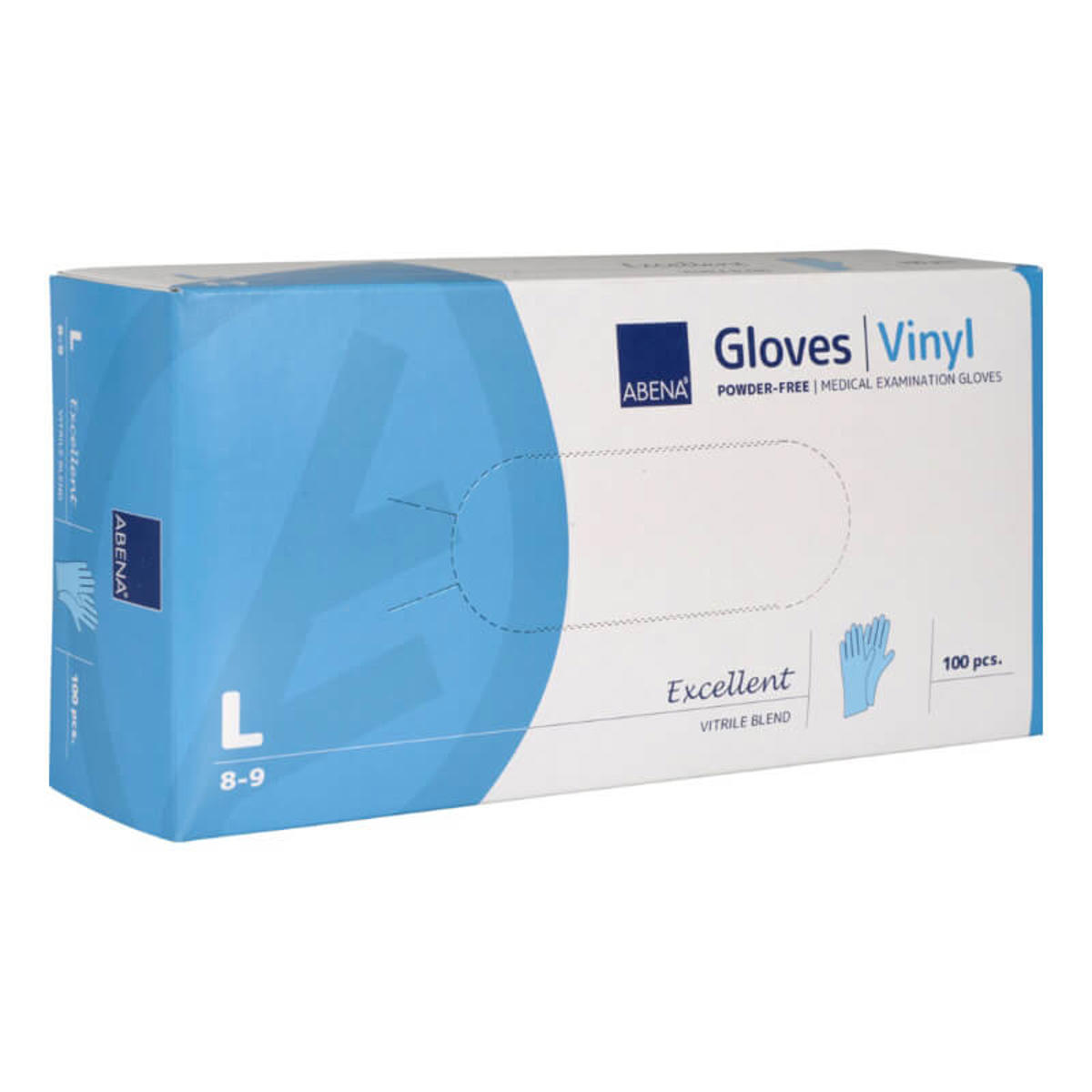 Undersøgelseshandske, ABENA Excellent, L, blå, vinyl, Vitrile blend, pudderfri, engangs.