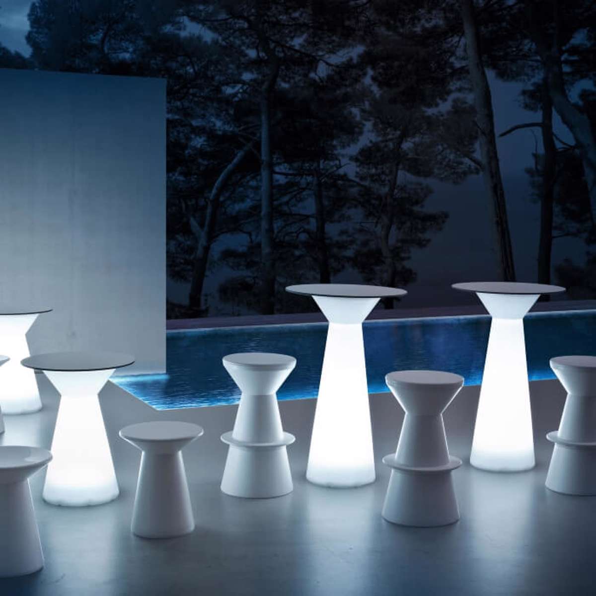 De fantasifulde former i Roller familien af borde og taburetter kan gøre enhver indendørs eller udendørs miljø mere interessant! De er fremstillet i techopolymer, der gør dem glatte, nemme at rengøre og ikke mindst robuste og velegnede til intensivt brug. Roller 75 er en spændende taburet, med fodstøtte, der passer perfekt til det illuminerede cafébord Roller. De er begge velegnet til udendørs brug, og sammen vil de give enhver udendørs servering, café, restaurant eller isbar et helt unikt look, der kan tiltrække kunder.