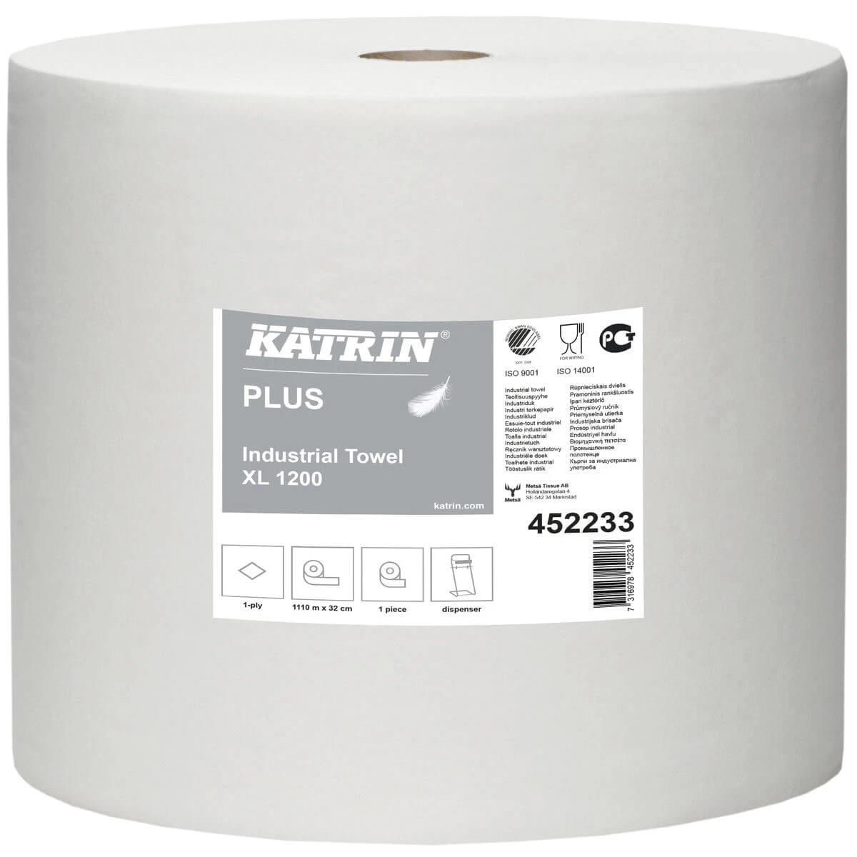 Katrin Plus industrielle aftørringsruller har en diameter på 37 centimeter og en bredde på 32 centimeter, hvilket giver en optimal balance mellem kapacitet og håndterbarhed. Det hvide nyfibermateriale sikrer en effektiv rengøring og absorbering af væsker, samtidig med at det er skånsomt mod overflader.