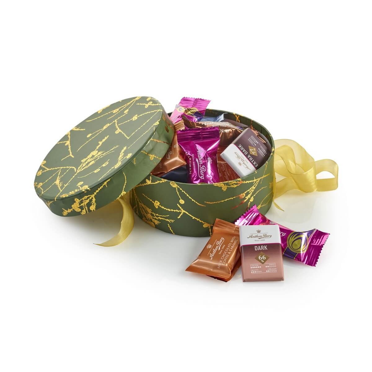 • Giv en elegant og anderledes julegaveæske med denne smukt dekorerede hatteæske i grøn med en lærkegren i guld på. Den indeholder 500 g klassisk Anthon Berg chokolade, hvilket gør gaven til et sikkert valg, når du vil glæde både medarbejdere, kunder eller samarbejdspartnere.
