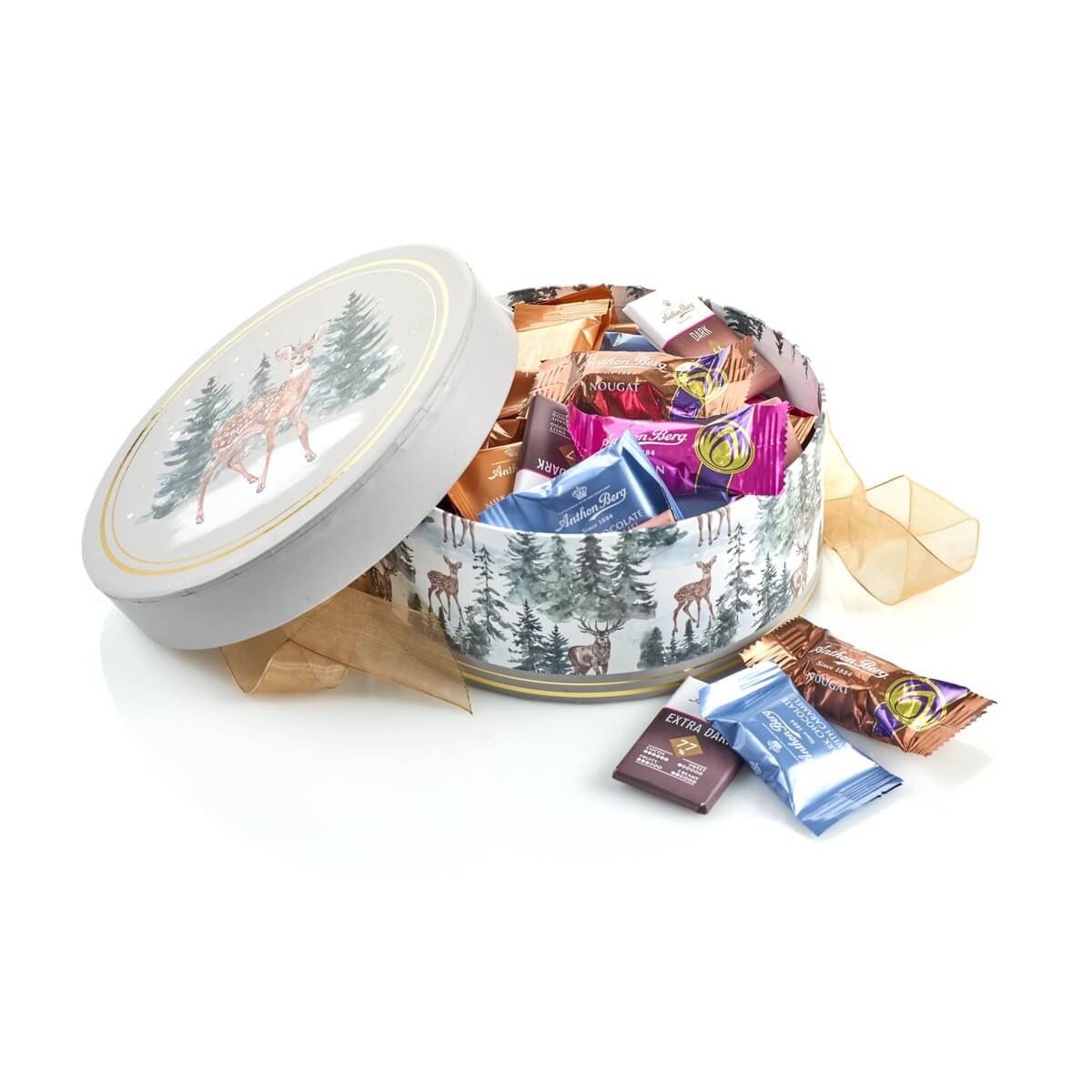 Indeni gemmer sig et lækkert udvalg af Anthon Bergs populære chokolader, perfekt til at dele på kontoret eller nyde derhjemme i juletiden.