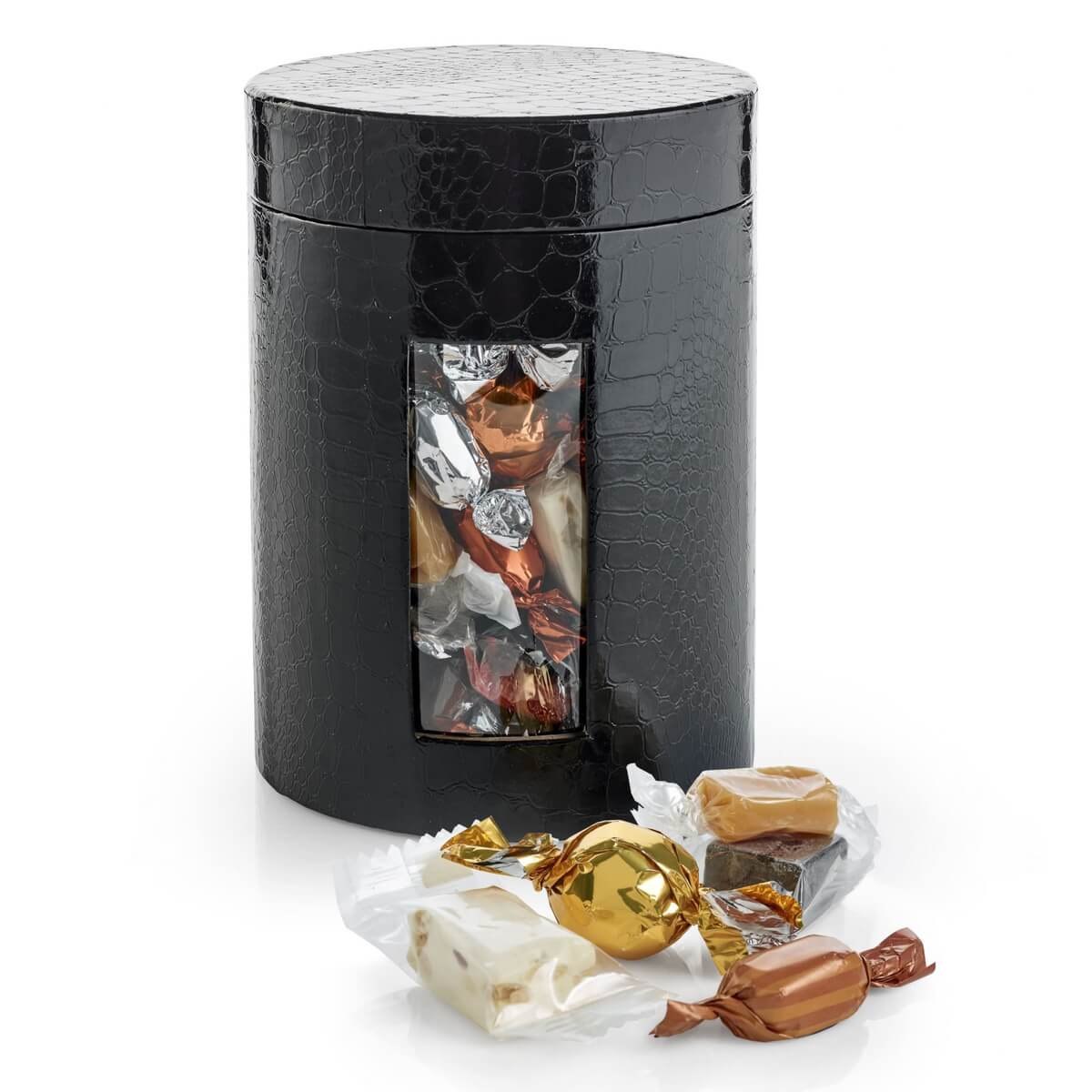 Som firmajulegave er den runde hatteæske et oplagt valg. Den stilrene sorte æske udstråler eksklusivitet og viser omtanke, mens indholdet giver et bredt udvalg af både chokolade, karameller og meget mere, til de som elsker at afprøve forskellige smagsvarianter.