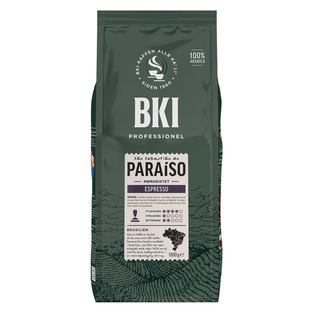 BKI Paraiso Espresso kaffe er dyrket af de mere end 140 kaffefarmere fra Paraíso-området i Brasilien, som BKI har samarbejdet med siden 2018 om at udvikle deres kaffeproduktion i en mere bæredygtig retning. Ved at vælge netop denne kaffe støttes disse farmere direkte. Kaffen byder på en særdeles afbalanceret smag med en stor fyldighed og lav syre. Smagsoplevelsen afrundes af en behagelig eftersmag med fine noter af hasselnød.